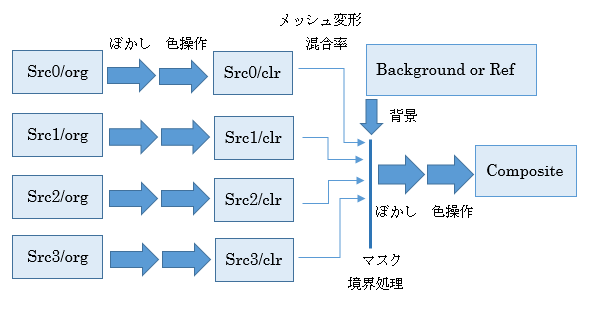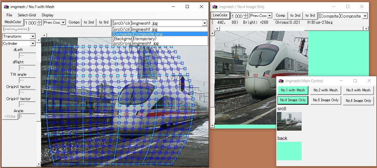 初期状態では「変形のための元画像(src/org)」「変色操作を行った元画像(src/clr)」「背景画像(back)」「合成結果の画像(Composite)」の4枚があります。