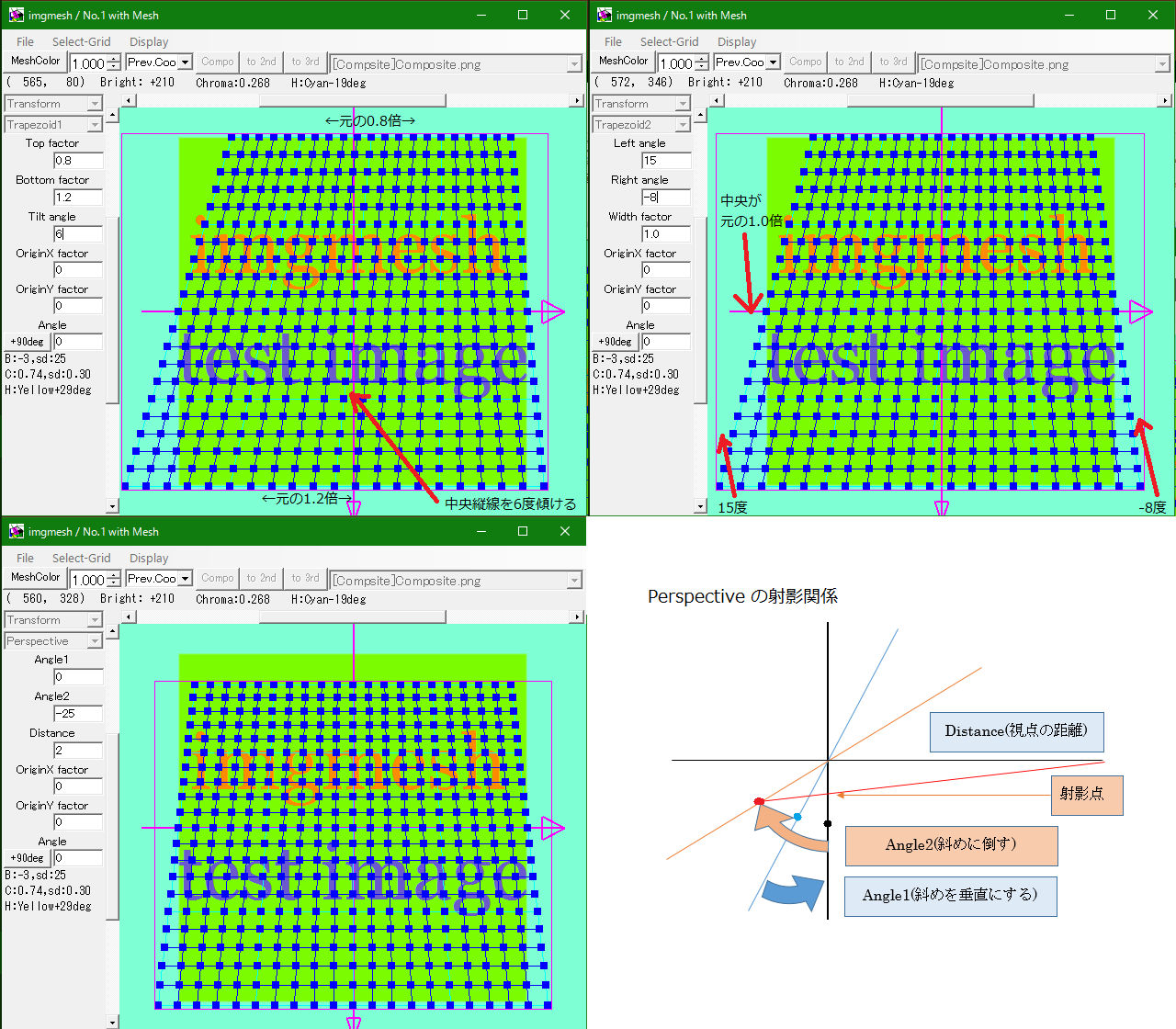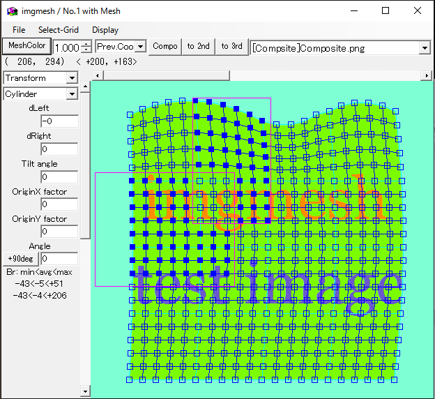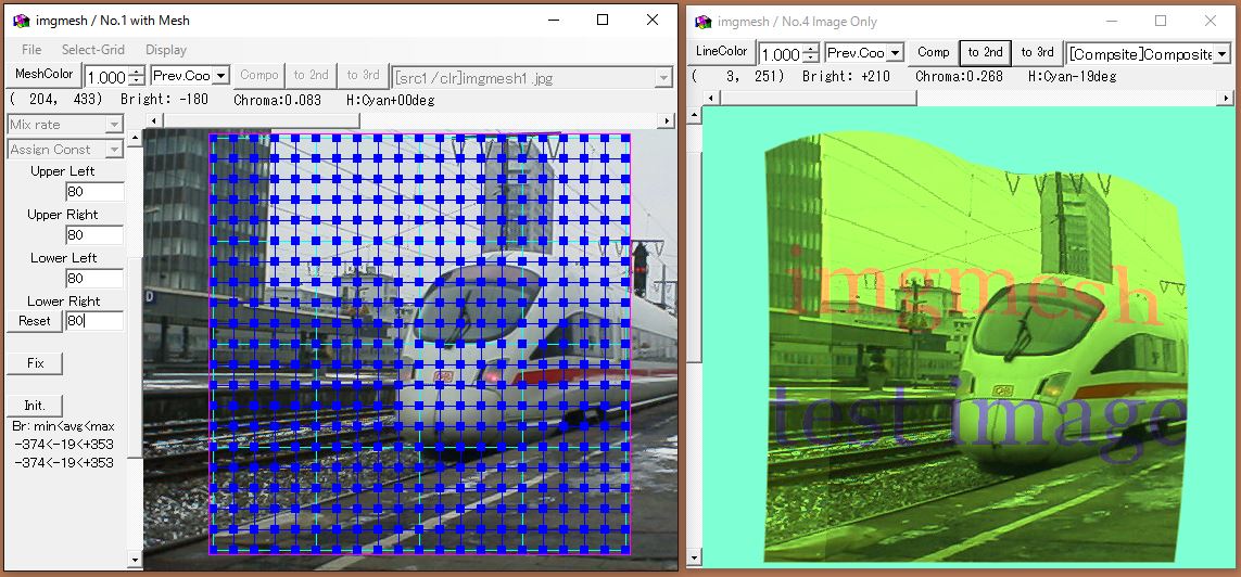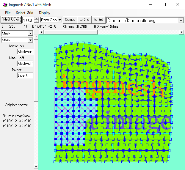 ・混合率 : 同じメッシュ位置の画像の色を、この比率で混合します。合計が100%を超えても明る過ぎ・暗過ぎになるだけです。