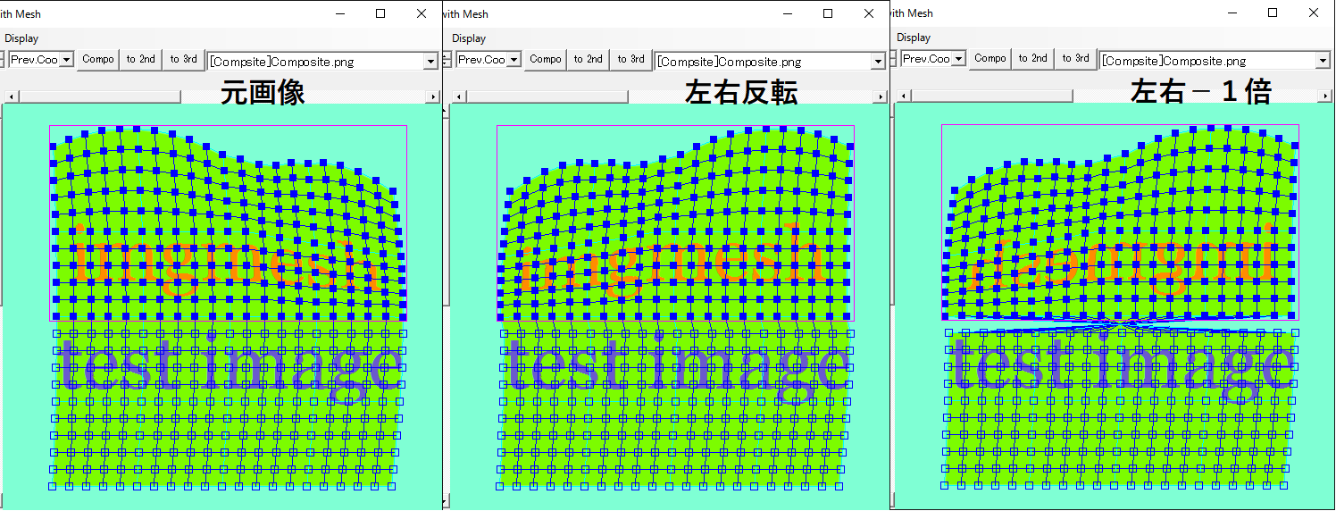 合成画面を表示していれば、マウスを離した時点で部分的に描画を行います。元画像側のメッシュを操作した場合、元画像側は変化しませんが、合成側は変化します。