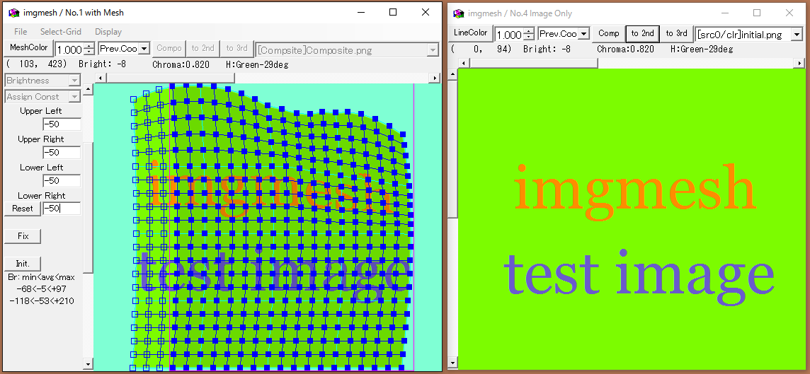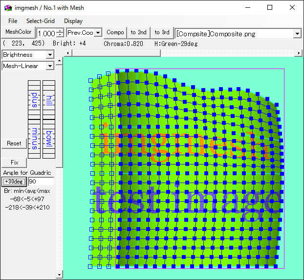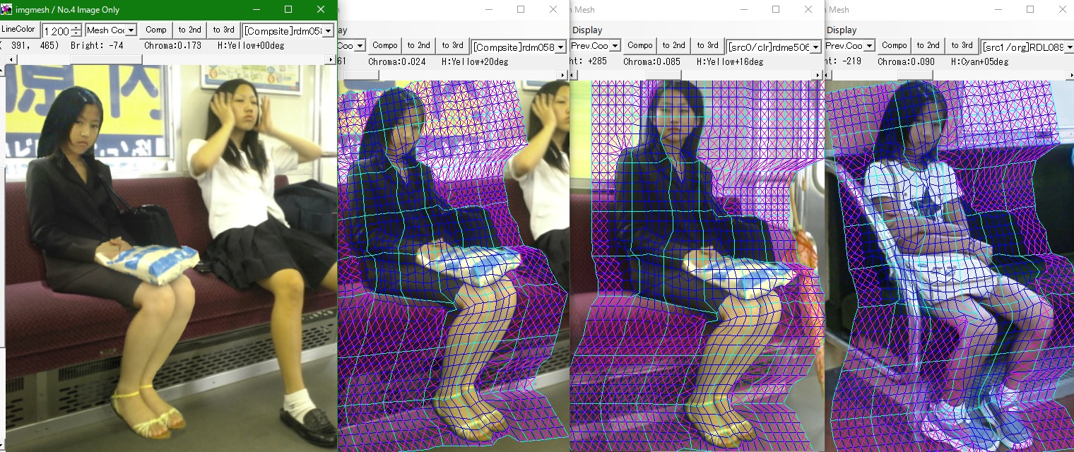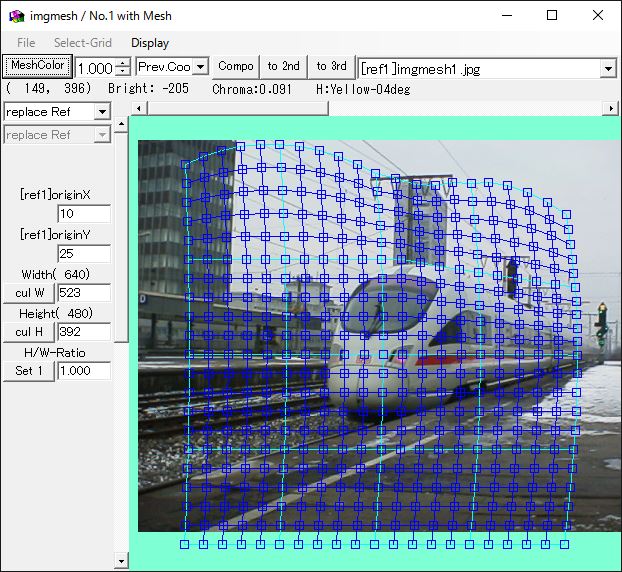 参照画像(ref)として追加した画像に関しては、画面サイズ自体は合成画像・背景画像と常に同じです。メッシュも同じものが表示され、色操作以外はどこからでも操作できます。