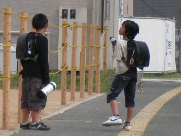赤いランドセルを背負って、とうとう近所の公立小学校の校門の前までやってきましたが、あと一歩のところでためらっております。